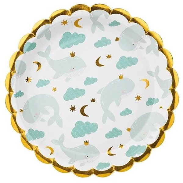 Kulaté papírové talíře se zlatým vroubkovaným okrajem a obrázky velryb se zlatými korunkami