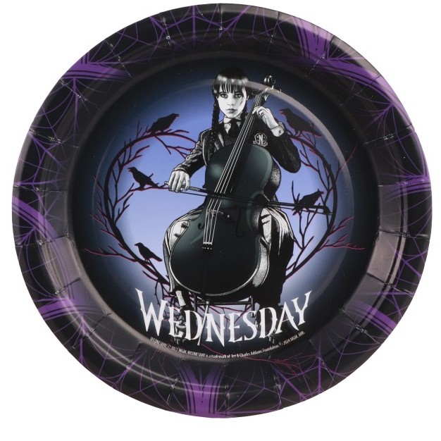 Dodejte svému tématickému večírku zvláštní nádech s těmito dezertními talířky „Wednesday Addams“! Tyto talířky jsou bez plastů, ideální pro dorty, svačiny nebo malé předkrmy a přinášejí středeční osobitý styl přímo na váš stůl. V jejich designu je ikonický potisk Wednesday Addams, hrající na violoncello, orámovaný tmavým vzorem pavučiny ve fialové a černé barvě.