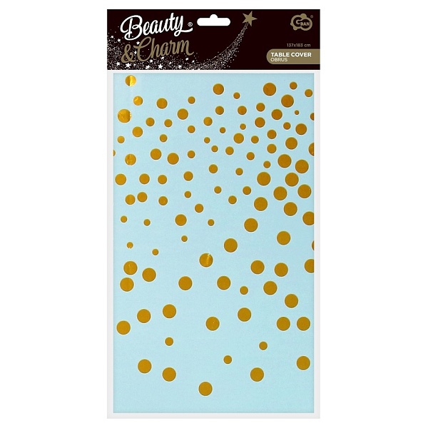 Dodejte svému stolu šarm a lesk s tímto světle modrým fóliovým ubrusem se zlatým potiskem puntíků z kolekce Beauty&Charm. Tento ubrus je vyrobený z nejkvalitnější fólie a je skutečným ztělesněním elegance v kombinaci jemného nebeského tónu s lesklými zlatými tečkami.