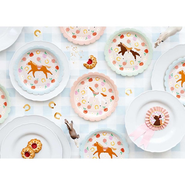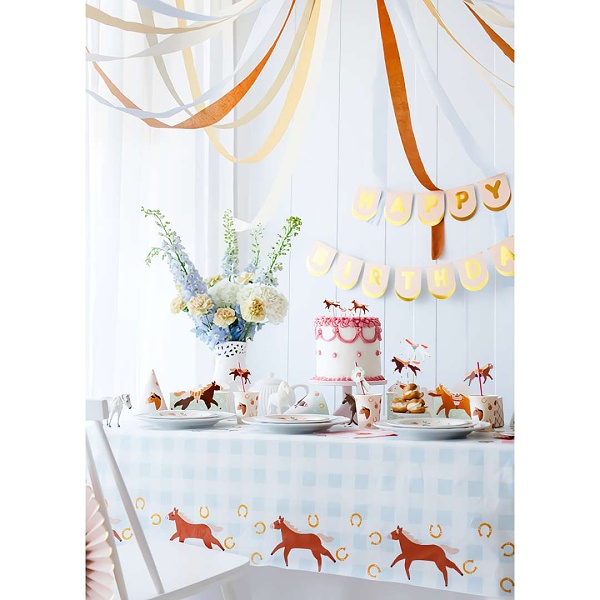 Důležitým doplňkem stolování při pořádání tématické párty Koníci je tento papírový ubrus s kostkovaným vzorem a obrázky koníčků.