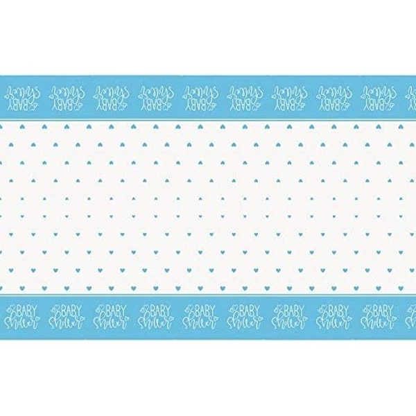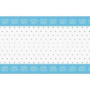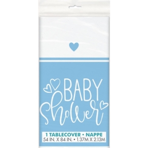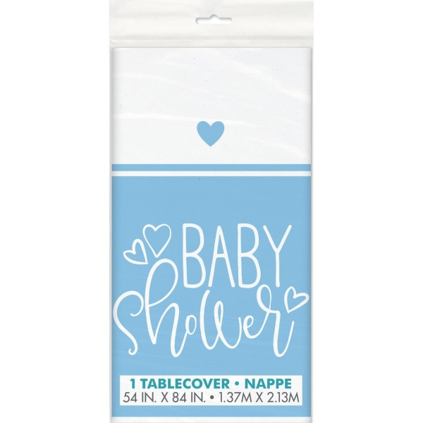 Krásný ubrus má světle modré okraje s modrými srdíčky a bílým nápisem Baby shower.