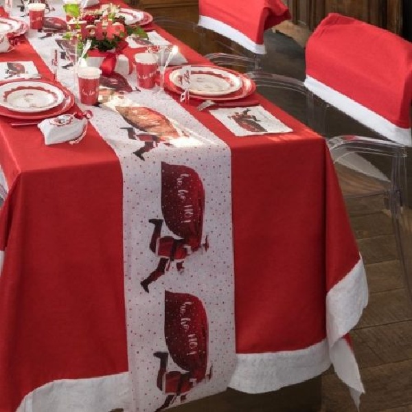 Vánoční červený obdélníkový ubrus ohraničený bílým pruhem, který připomíná čepici Santy Clause.