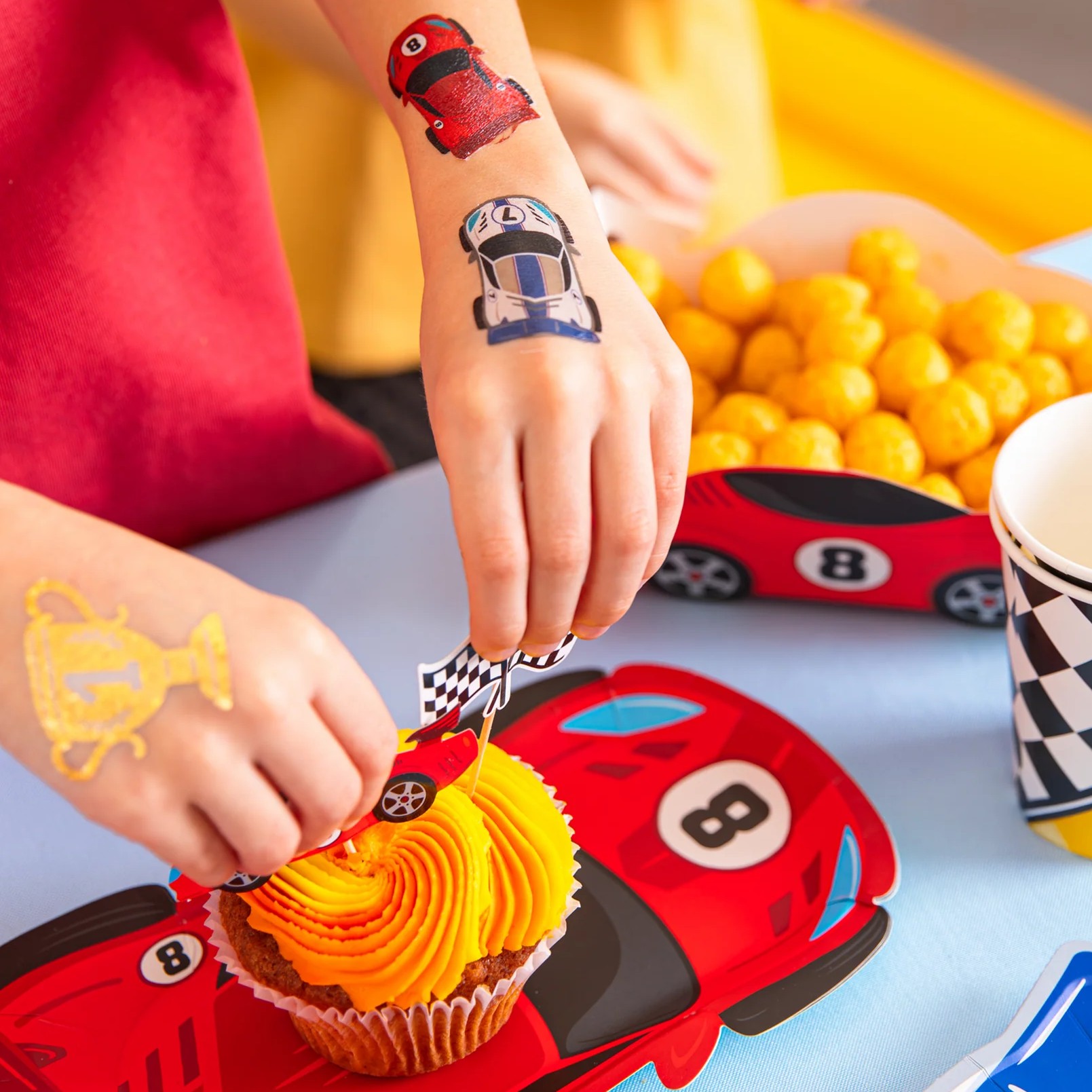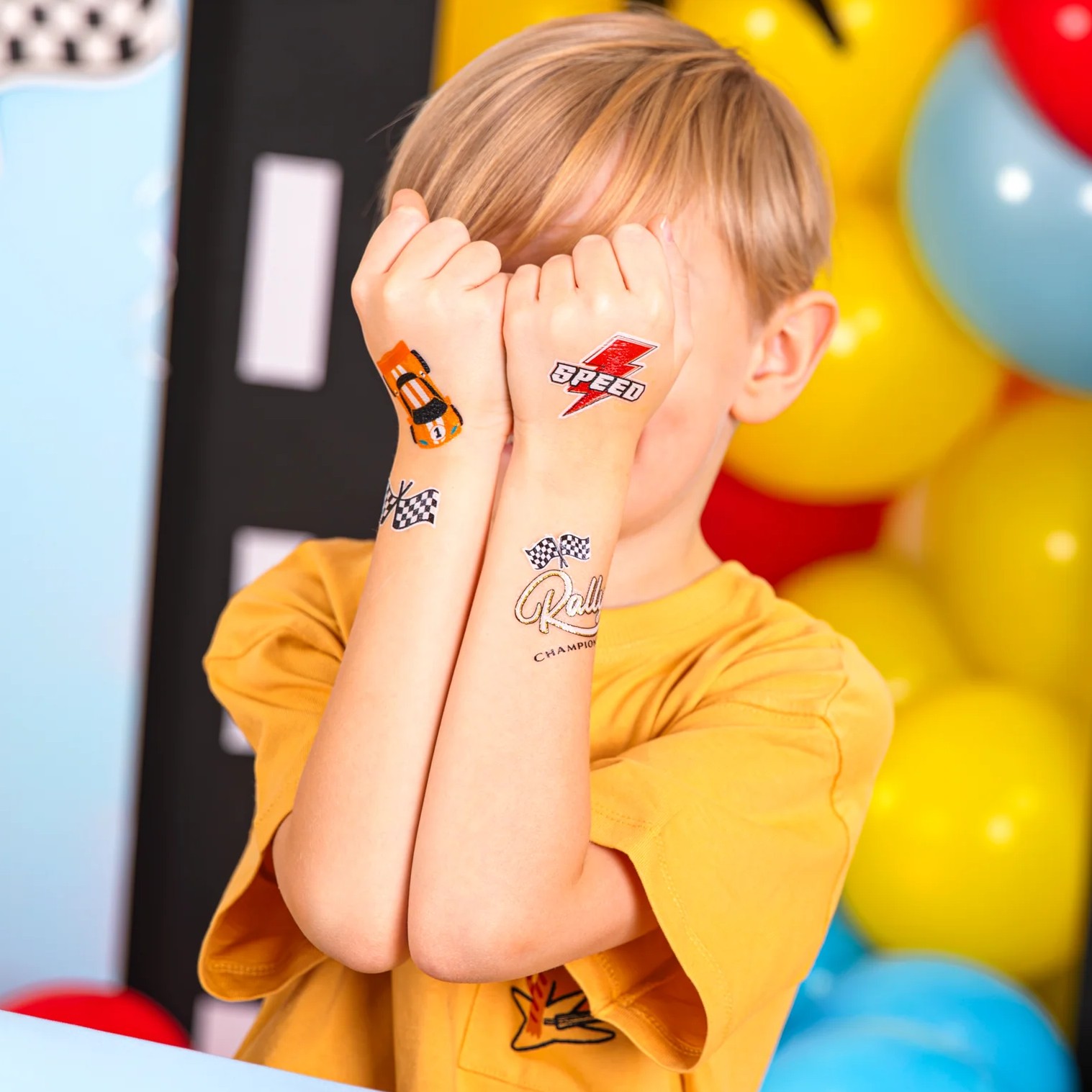 Dočasné tetování závodní auta jsou skvělým doplňkem na dětskou párty pro všechny malé nadšence rychlých aut a závodění. Snadno se aplikují pomocí vody, takže si děti mohou užít vlastní „závody“ přímo na rukou nebo v obličeji bez složitého líčení.