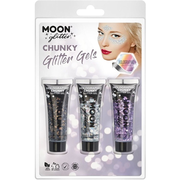 Set glitrových holografických gelů Moon glitter lze použít na pleť i vlasy.