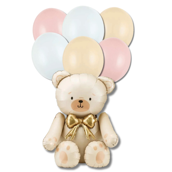 Roztomilý pastelový balónkový buket s medvídkem, který je ideální dekorací pro narození miminka, baby shower, křtiny i první narozeniny. Jemné neutrální barvy se hodí jak pro holčičku, tak pro chlapečka a krásně doladí slavnostní výzdobu.