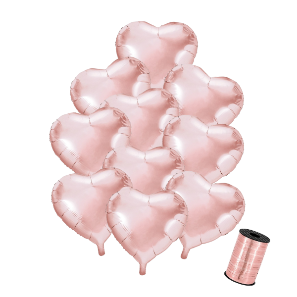 Skládá se z: 10 ks fóliových balónků ve tvaru srdce v barvě růžového zlata (45 cm) a 1 ks vázací stuhy (5 mm / 225 m) v odstínu Rose Gold.