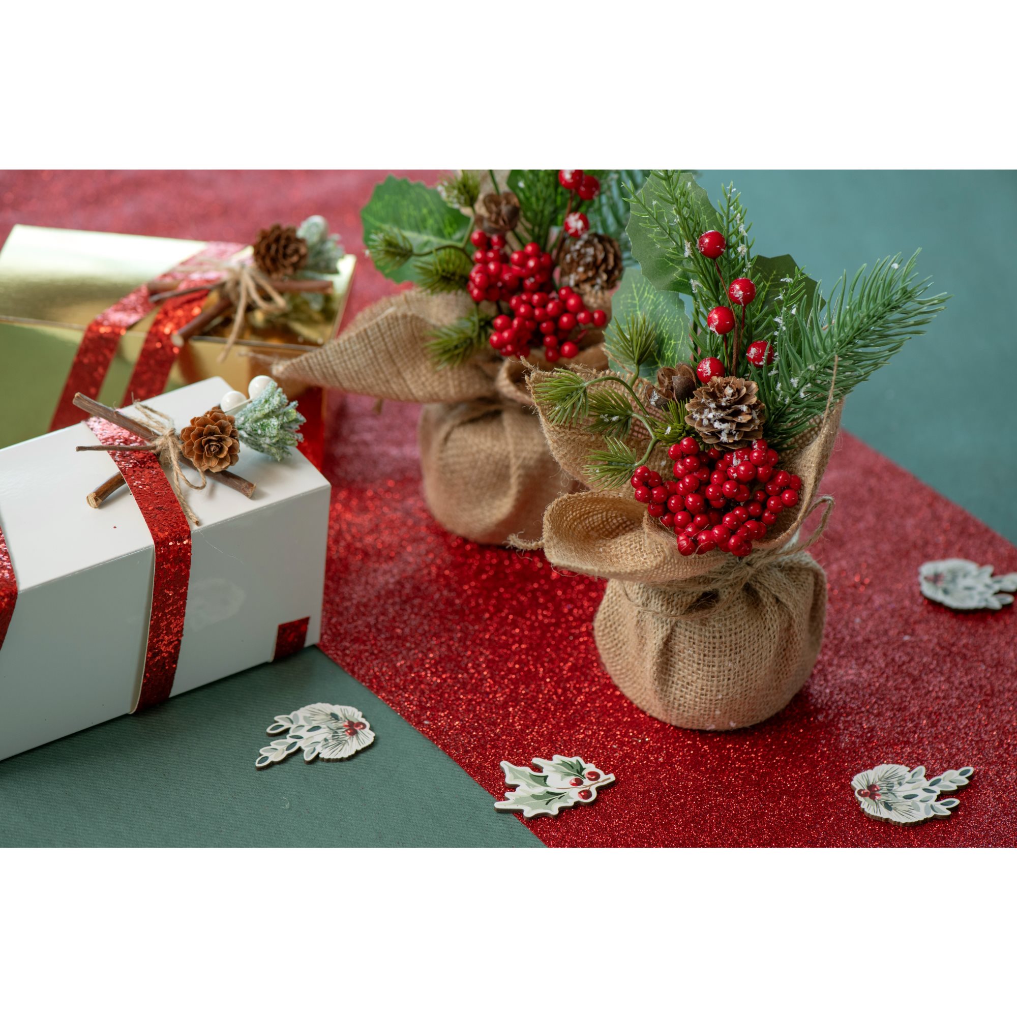 Dekorace obsahuje ozdobné větvičky, červené jeřabiny a šišky. Vše je zabalené v jutovém jutového materiálu, který dodává dekoraci rustikální charakter.