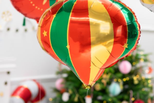 Vánoční ozdoba z matné fólie v červené barvě se zeleným a zlatým metalickým potiskem, velikost cca 51 x 49 cm (20 x 19'').