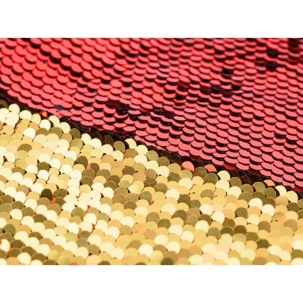 Čepička s reverzibilními flitry (červená a zlatá) je stylový vánoční doplněk.