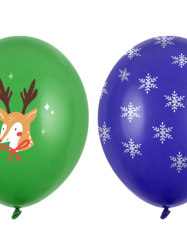 Silné balónky Merry Christmas s potiskem, sada obsahuje 2 vzory: v zelené barvě Leaf Green s barevným oboustranným potiskem, v modré barvě Night Blue s bílým pětistranným potiskem, průměr cca 30 cm. (1 ks / 50 ks)