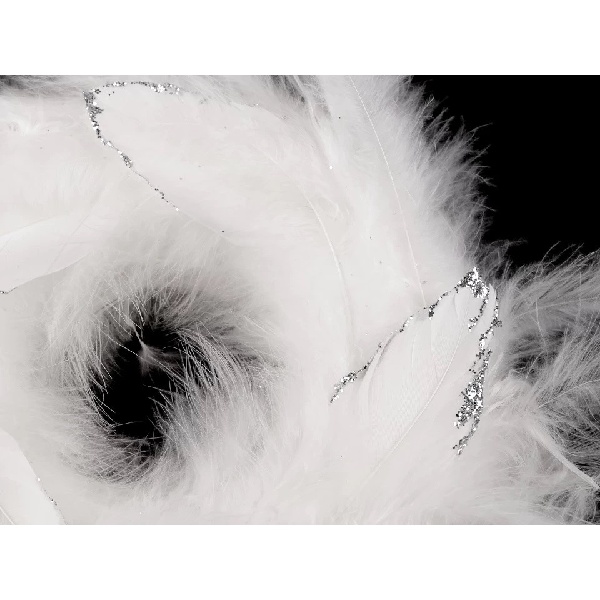 Vánoční věnec z bílých peříček, protkávaných stříbrnou ozdobou vám bude krásně zdobit zimní, adventní i vánoční čas.