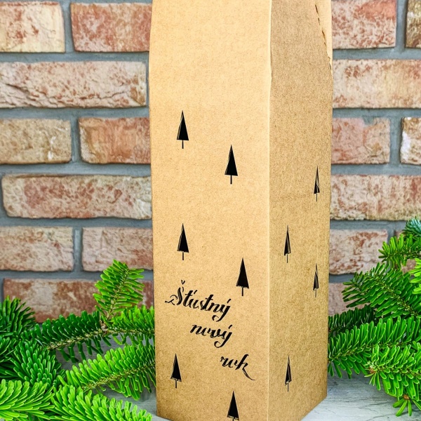 Víno v krabici s motivem stromečků a nápisem Šťastný Nový rok je tak zajímavě a rychle zabalené. Dárková krabice na víno je vyrobena z kvalitní hladké lepenky, která zaručuje vysokou pevnost. Motiv je vytvořen laserovým výsekem a spolu s okénkem umožňuje průhled do krabice na láhev v ní umístěnou.