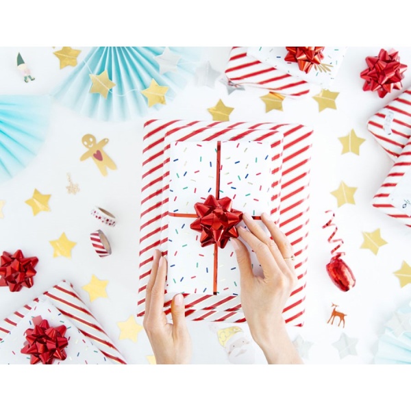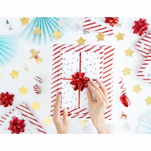 Sada na balení dárků obsahuje 2 ks nalepovacích červených hvězdiček a 10 m stuhy v červené metalické barvě.