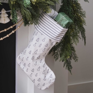 Zavěste tuto krásnou punčochu v bílé barvě s motivem stromečků na zeď, nebo ji naplňte těmi nejkrásnějšími vánočními dárky.