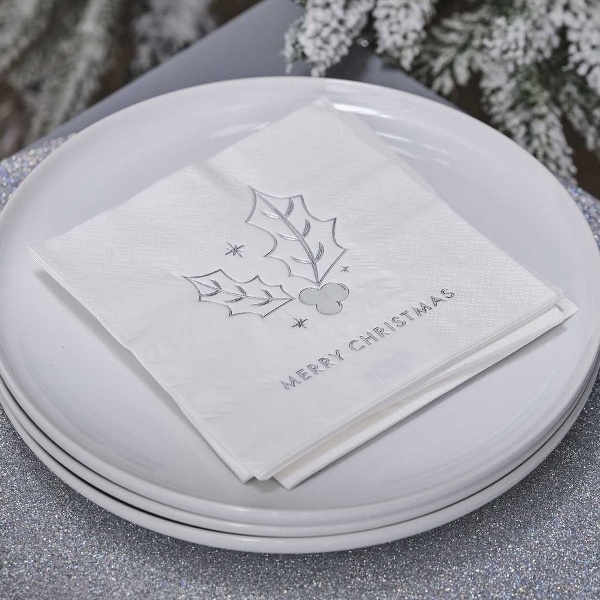 Stylové a elegantní ubrousky s potiskem cesmíny ve stříbrné barvě a nápisem Merry Christmas
