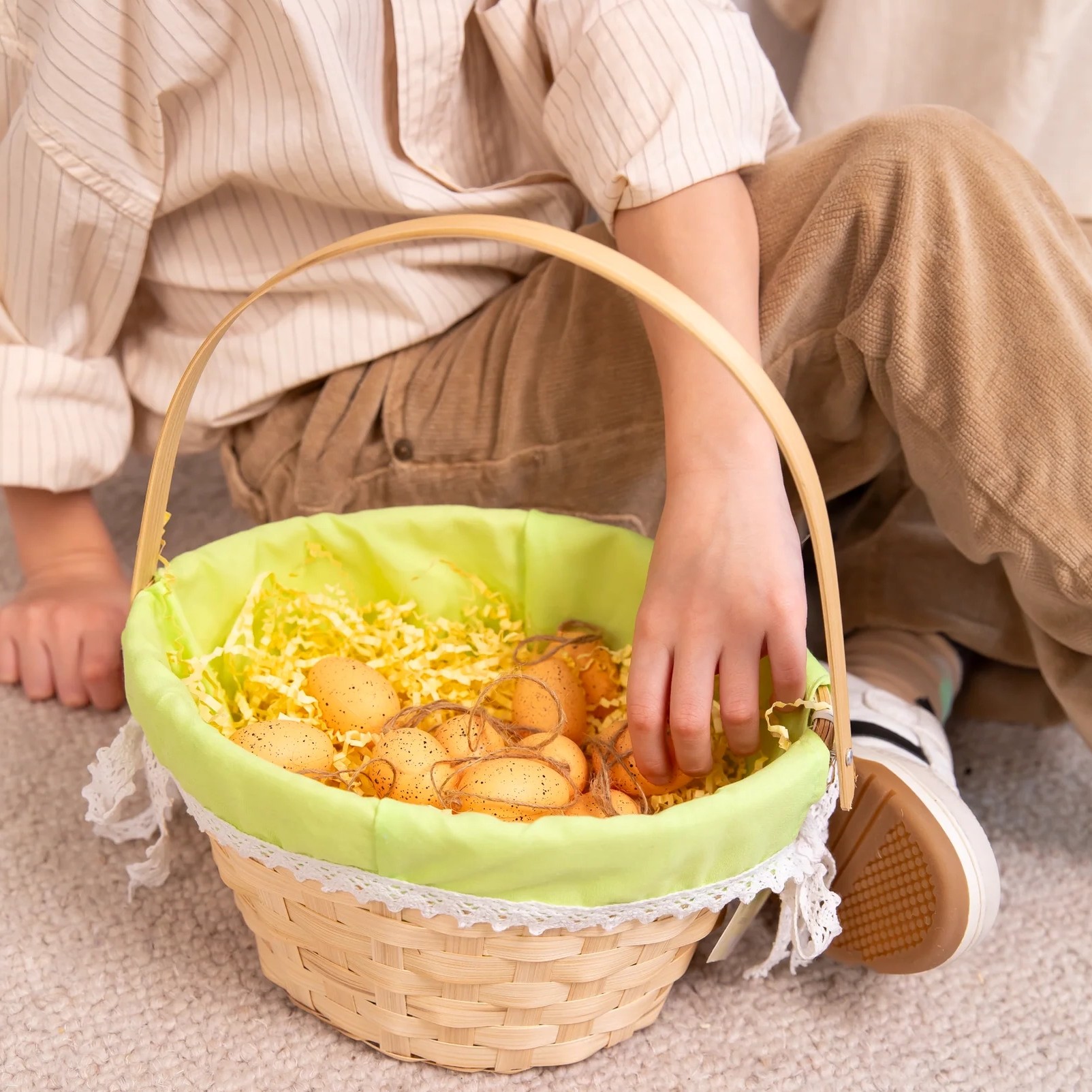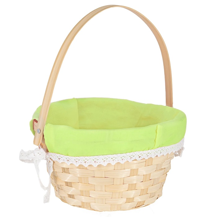 Tento krásný a tradiční košík je vyrobený z kvalitního bambusu a je vystlaný jemnou zelenou látkou, která dodává jeho vzhledu svěžest a eleganci. Krajkové zakončení přidává jemný rustikální nádech, díky čemuž je vhodný nejen na Velikonoce, ale i na jiné příležitosti, jako jsou Boží tělo, aranžování květin či balení dárků.