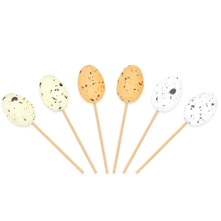 | Zápichy malá křepelčí vajíčka na špejli Sada vícebarevných křepelčích vajíček s tmavými skvrnami: bílá, pastelově žlutá a … |