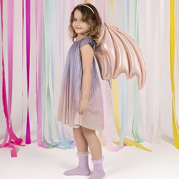 Křídla lze snadno připevnit a jsou originální prvek například ke kostýmu netopýra. Jsou světle růžová a mají charakteristickou holografickou strukturu, která je vysoce lesklá.
