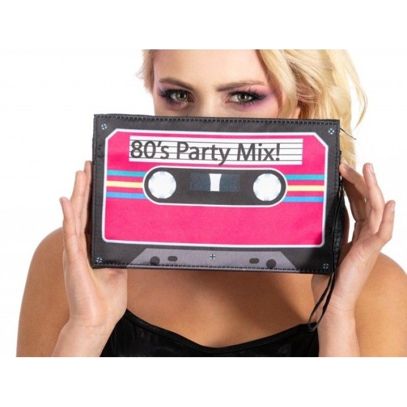 Kazetový tvar této kabelky se zipem a její potisk v černé a fuchsiové barvě je s nápisem "80's Party Mix" na přední straně.