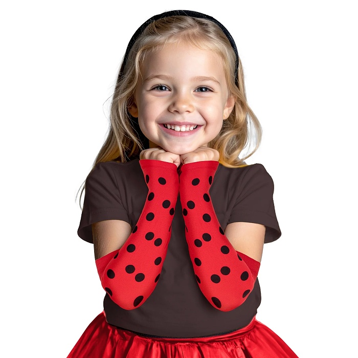 Červené párty rukavice bez prstů s černými puntíky jsou výrazným doplňkem ke kostýmu, který okamžitě upoutá pozornost.