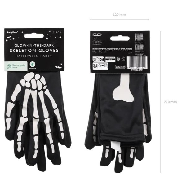 Rukavice jsou velikosti S/M, délka cca 39,5 cm a obvod cca 30 cm. Jsou lehké a odolné a jejich prvky svítící ve tmě dodávají děsivý efekt, který bude viditelný i na tmavých místech.
