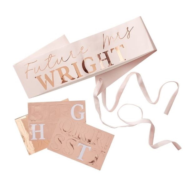 Personaizovaná šerpa s nápisem "Future Mrs ..." v barvě růžového zlata je důležitým doplňkem na rozlučku se svobodou a potěší každou budoucí nevěstu i jejího ženicha. Budoucí příjmení nevěsty si k nápisu sami dotvoříte z nalepovacích písmenek, které jsou součástí balení.