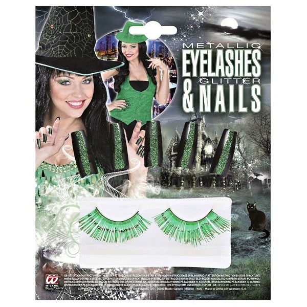 Třpytivé zelené umělé nehty a řasy doplní váš čarodějnický outfit.