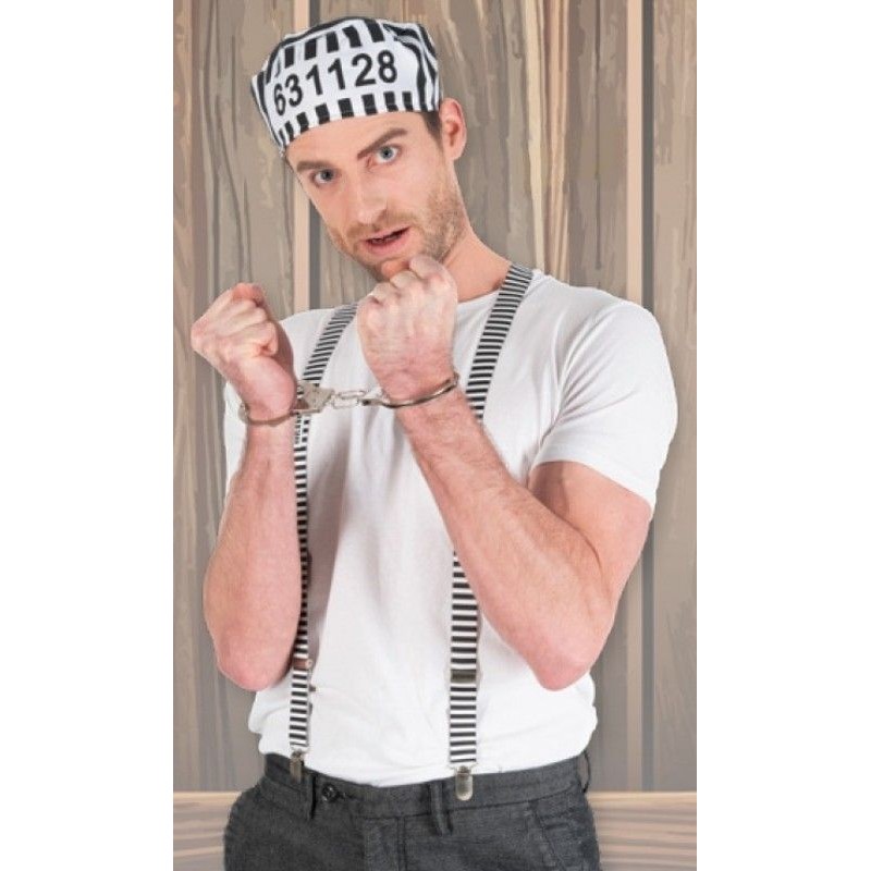 | Trojdílný vězeňský set Sada obsahuje pouta, šle a pruhovanou vězeňskou čepici s číslem Všechny kostýmové doplňky jsou … |