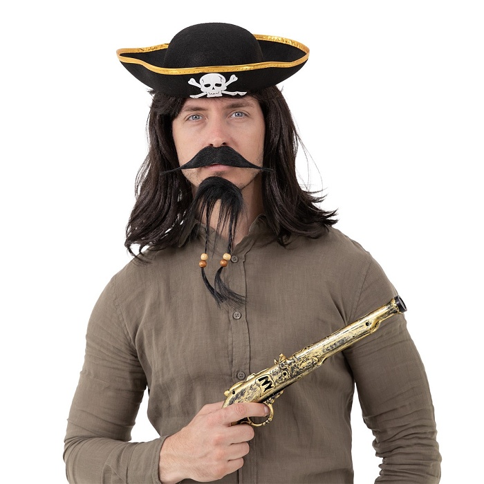 | Pirátská sada - umělé vousy s korálky a knír v černé barvě. Samolepicí výrobky. Perfektní doplněk k pirátskému kostýmu … |