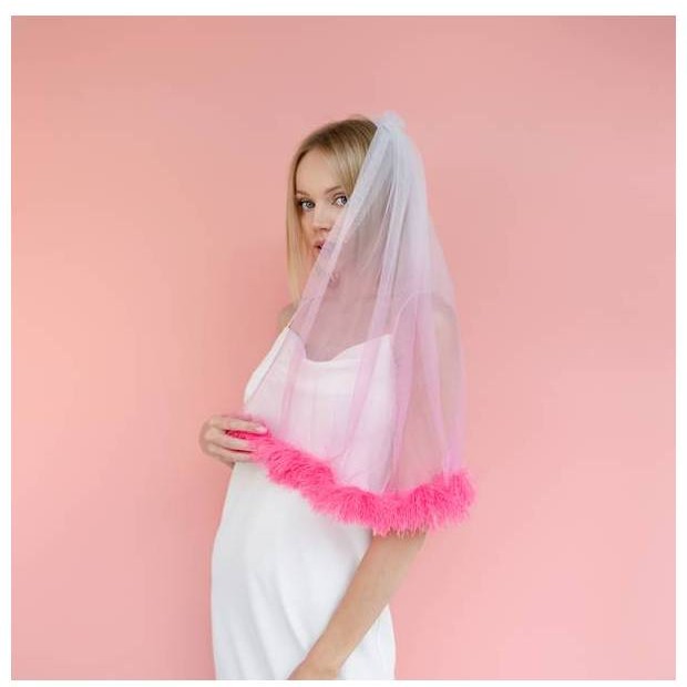 Závoj s růžovým chmýřím je vyrobený v okouzlujícím růžovém ombre odstínu, který postupně přechází ze světlé do tmavé a vytváří vizuální efekt, který je poutavý a jemný.