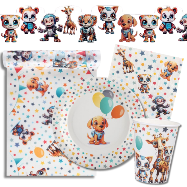 Veselý set se zvířecí tematikou pro radostné dětské oslavy plné barev a smíchu! Ideální pro narozeniny malých dobrodruhů.