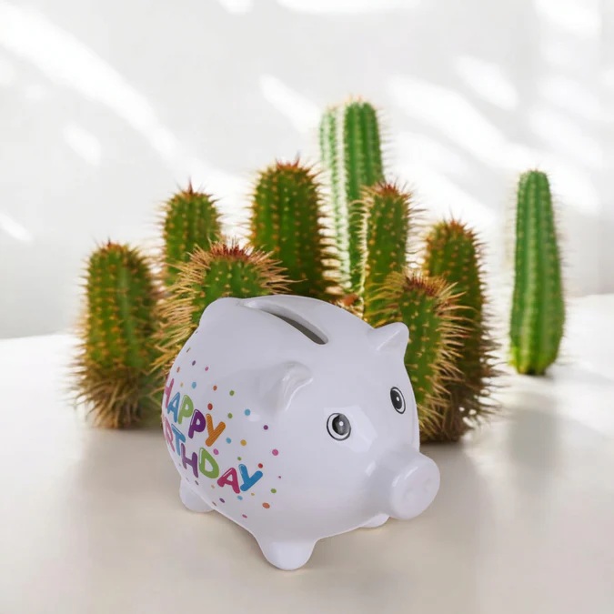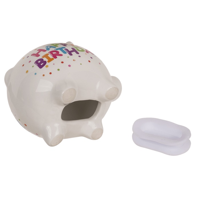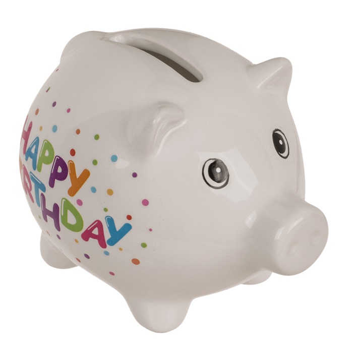 Prasátko je keramické s barevným nápisem Happy Birthday.
