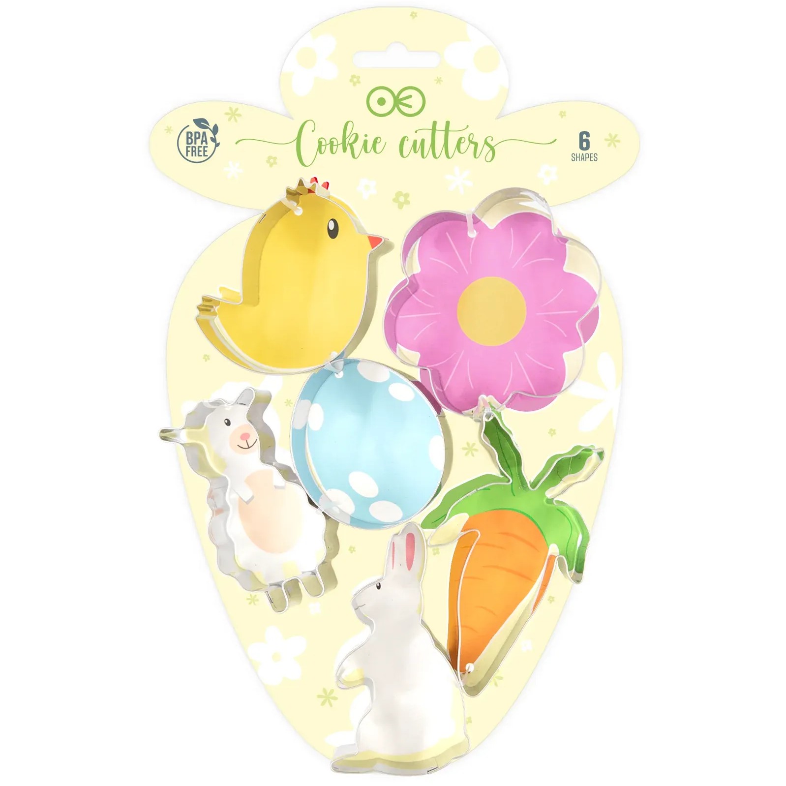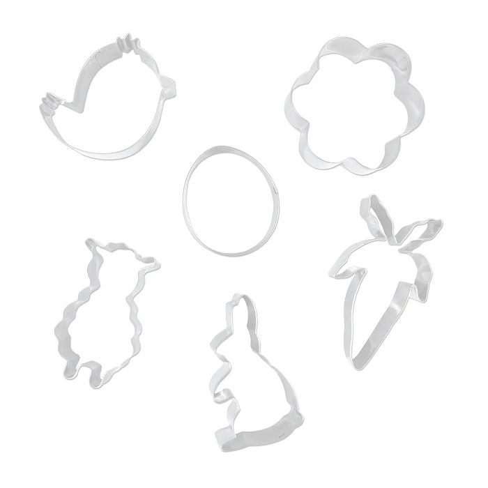 Sada obsahuje 6 ks kovových vykrajovátek a jsou ideálním pomocníkem na pečení a zdobení velikonočních dobrot. Tato vykrajovátka vám umožní vytvořit originální a tematické tvary, jako jsou kuřátko, květina, mrkev, jehňátko, vajíčko a zajíček.