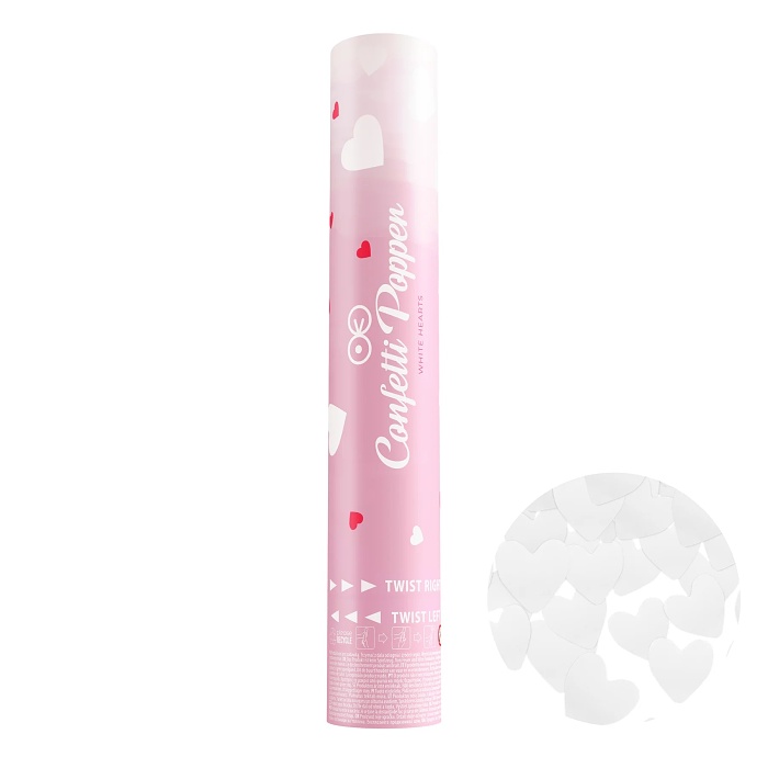 Překvapte své hosty záplavou konfet v podobě bílých srdíček z jemného papíru, které pouhým otočením tubusu vystřelíte do vzduchu a snesou se jako déšť k zemi.