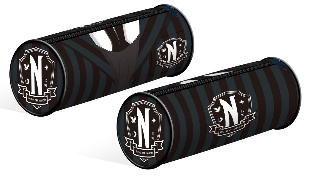 - Kulatý penál s uzavíráním na zip s licenčním motivem Wednesday.
