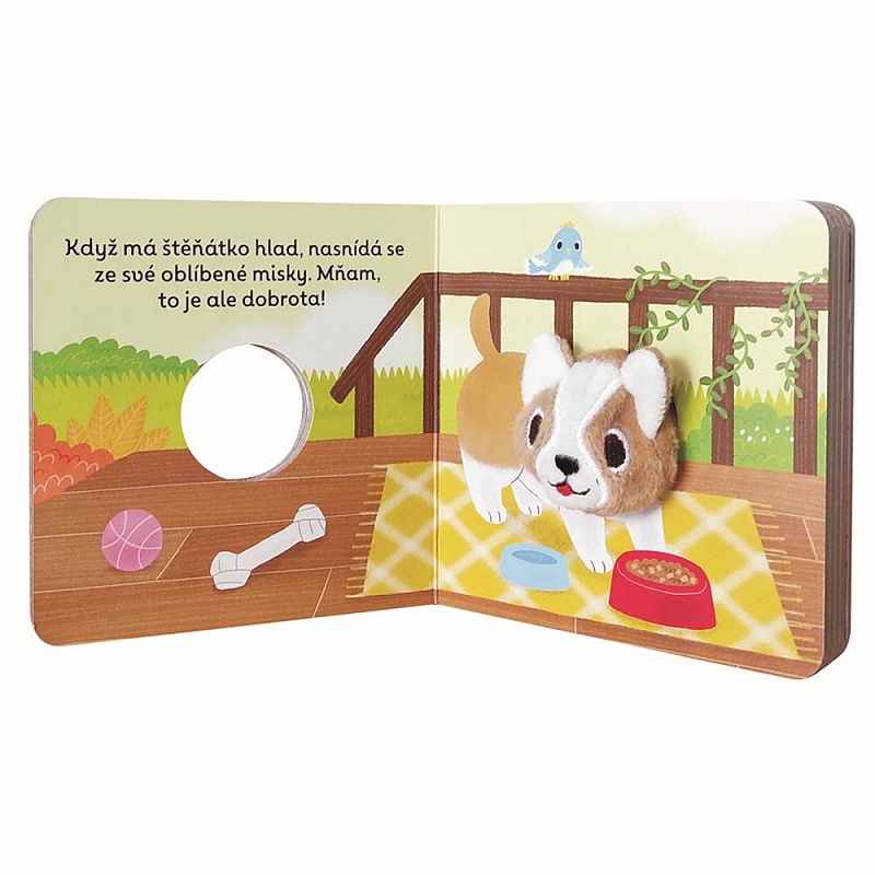Pomocí maňáska oživíte roztomilý příběh štěňátka, které poznává svět kolem sebe. Veselé štěňátko ochutná první psí dobroty, seznámí se s veverkou a objevuje radost z aportování klacíku či válení se v měkké trávě.