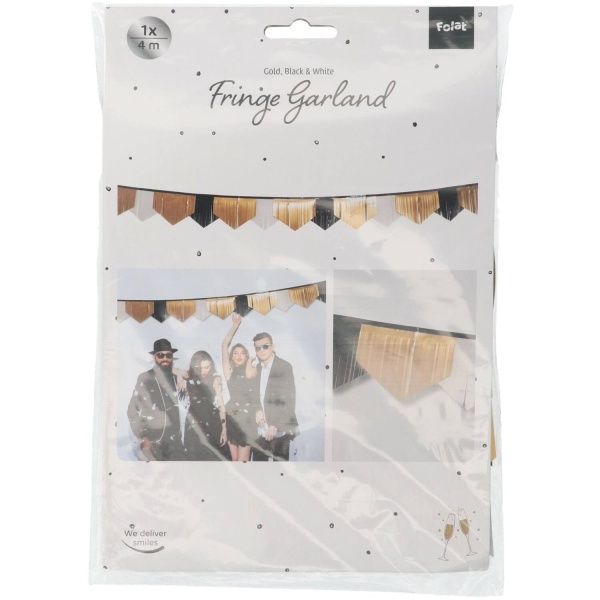 Tato třásňová girlanda ve černé, zlaté a bílé barvě bude elegantním doplňkem výzdoby na vaši narozeninovou oslavu, oslavu výročí a jiných slavnostních událostí.