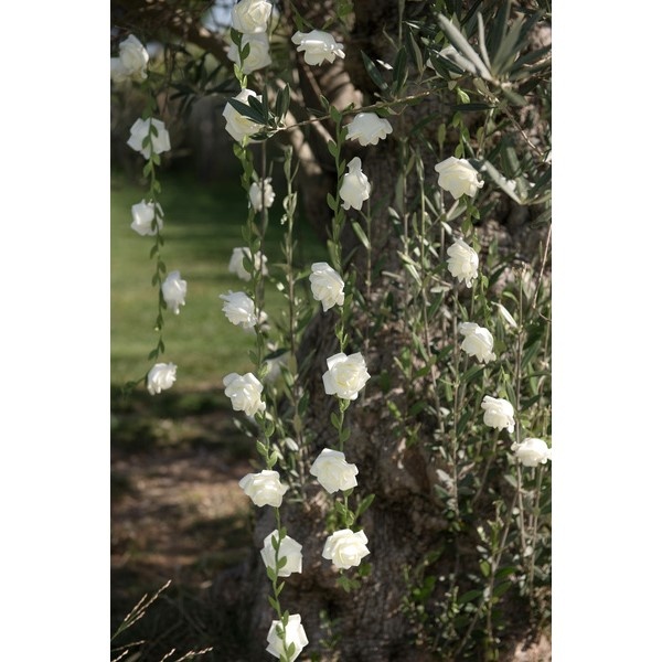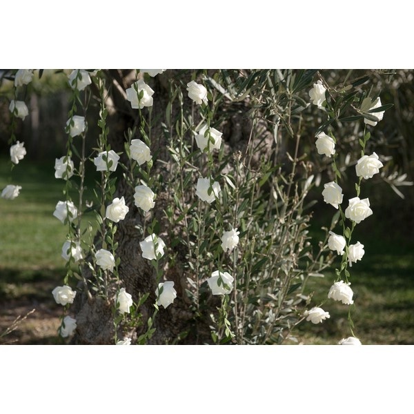 Květinová girlanda s bílými růžičkami a malými listy je krásný doplněk k ozdobení vaší svatby nebo jiné slavnostní párty.