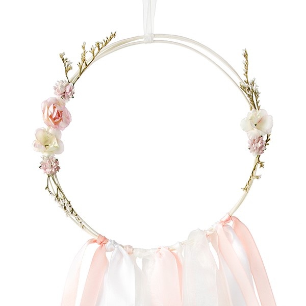 Balení obsahuje 3 ks směsi pastelových barev. Stuhy jsou připevněny na ratanovém kole s květinami.