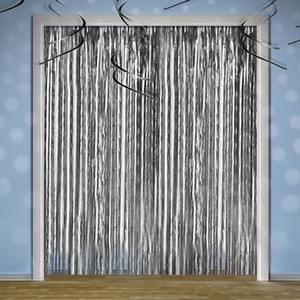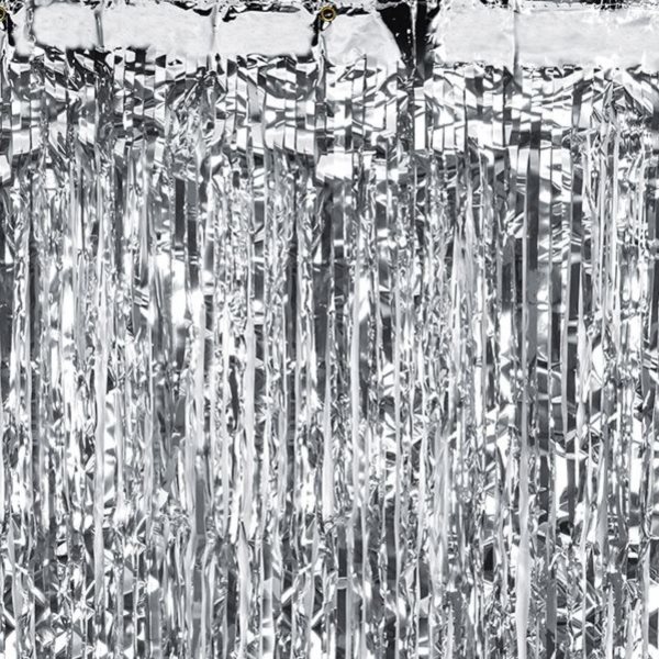 Závěs na pozadí z lesklé fólie je tvořen stříbrnými fóliovými proužky