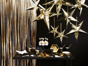 Párty závěs ve zlaté barvě je vhodný k dekoraci fotokoutku, sweet baru, narozeninové oslavy, párty ve zlaté barvě nebo jiné slavnostní příležitosti.
