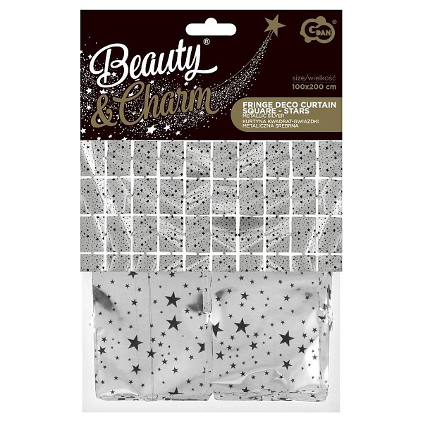 Dekorativní závěs ve stříbrné barvě, zdobený černými hvězdičkami v různých velikostech.