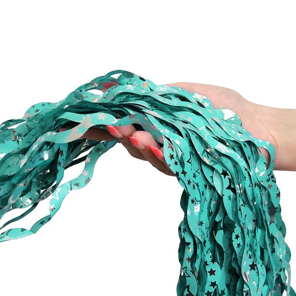 Dekorační zvlněný závěs v tyrkysové barvě se stříbrnými hvězdičkami je vhodný k dekoraci fotokoutku, sweet baru,