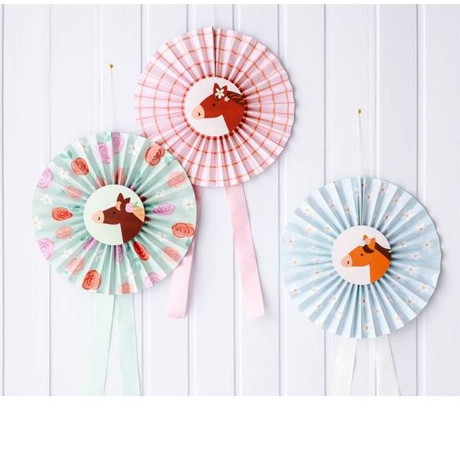 | Papírové dekorativní rozety se stuhou v mixu barev s hlavami koníčků Jejich průměr po složení je cca 35 cm Barva: … |