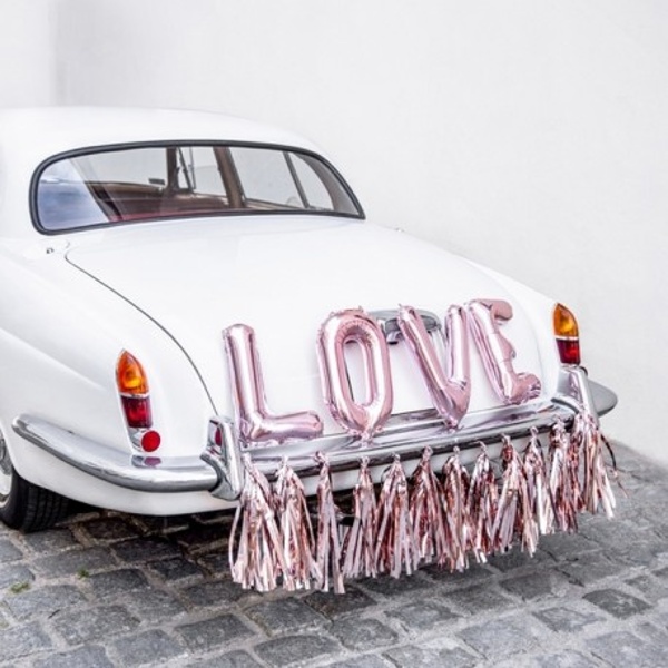 třásňová girlanda ve stejném odstínu o rozměru 30 cm x 1,5 m, balónková písmena L,O,V,E