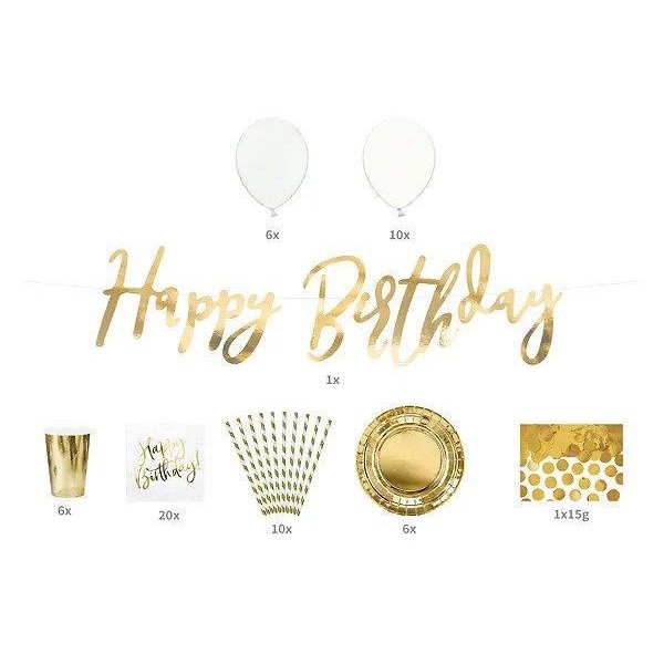 1x zlatou girlandu k narozeninám, 6x zlaté papírové kelímky, 6x zlaté papírové talíře, 10x papírová brčka, 20x ubrousky s nápisem „Happy Birthday“, 15g zlaté konfety, 10x bílé latexové balónky a 6x průhledné latexové balónky.
