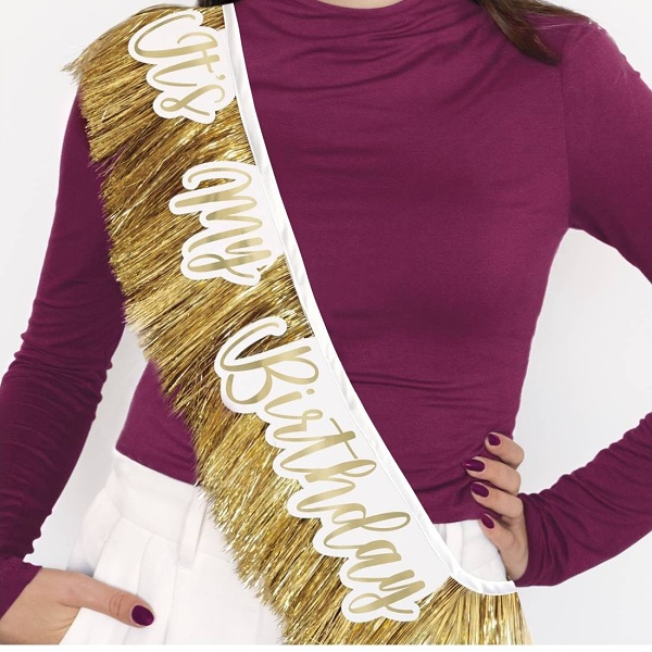 Originální narozeninová šerpa se zlatými třásněmi a nápisem Its my Birthday